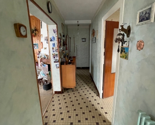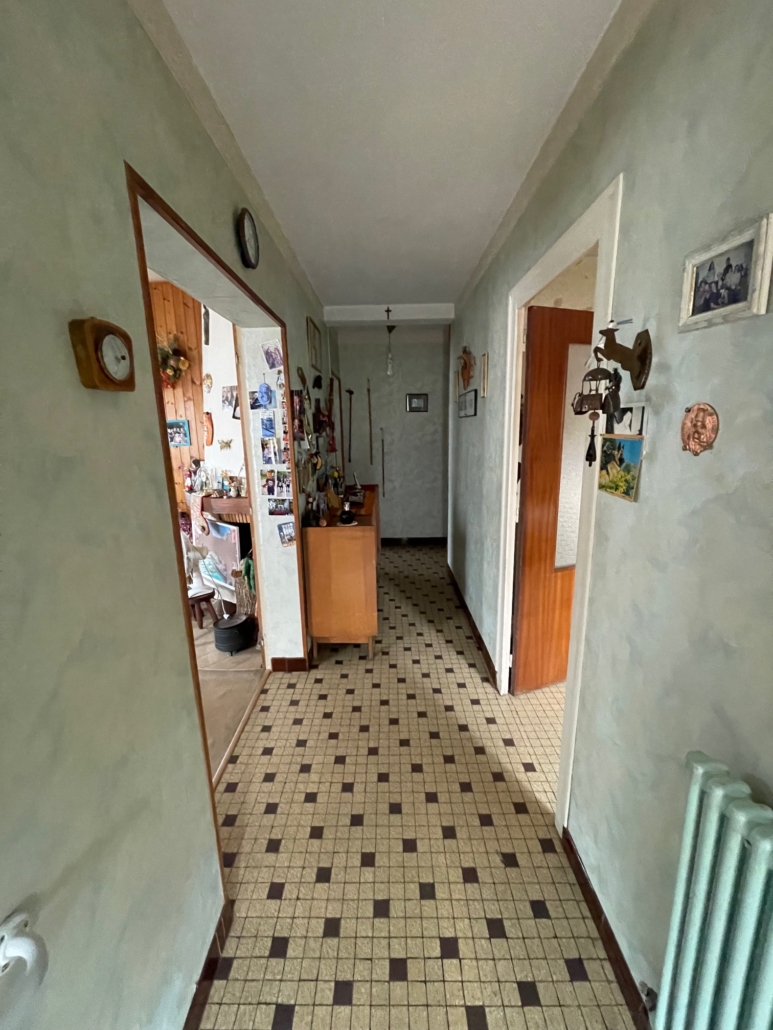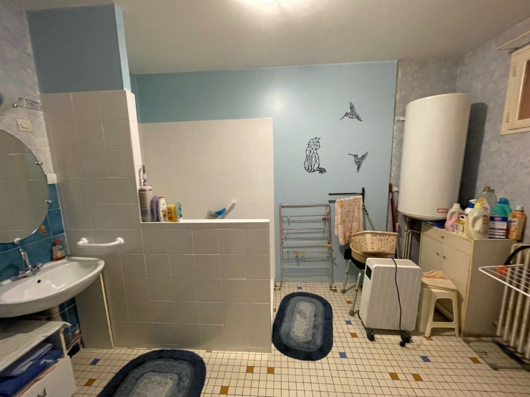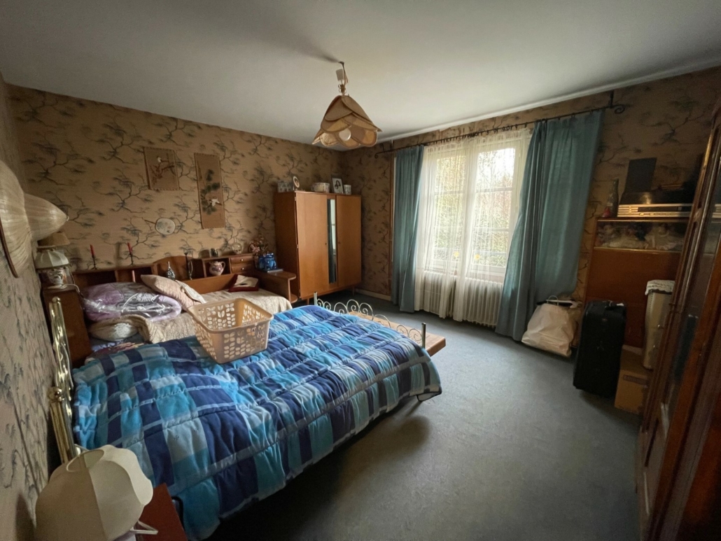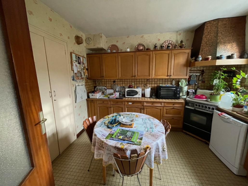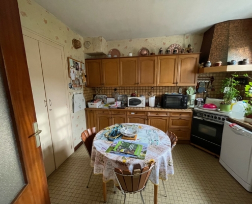 Entrée, cuisine aménagée, séjour- salon avec cheminée (foyer ouvert), salle d’eau, WC, dégagement, 2 grandes chambres. Cave, autre corps de bâtiment. Chauffage fioul. Travaux à prévoir.